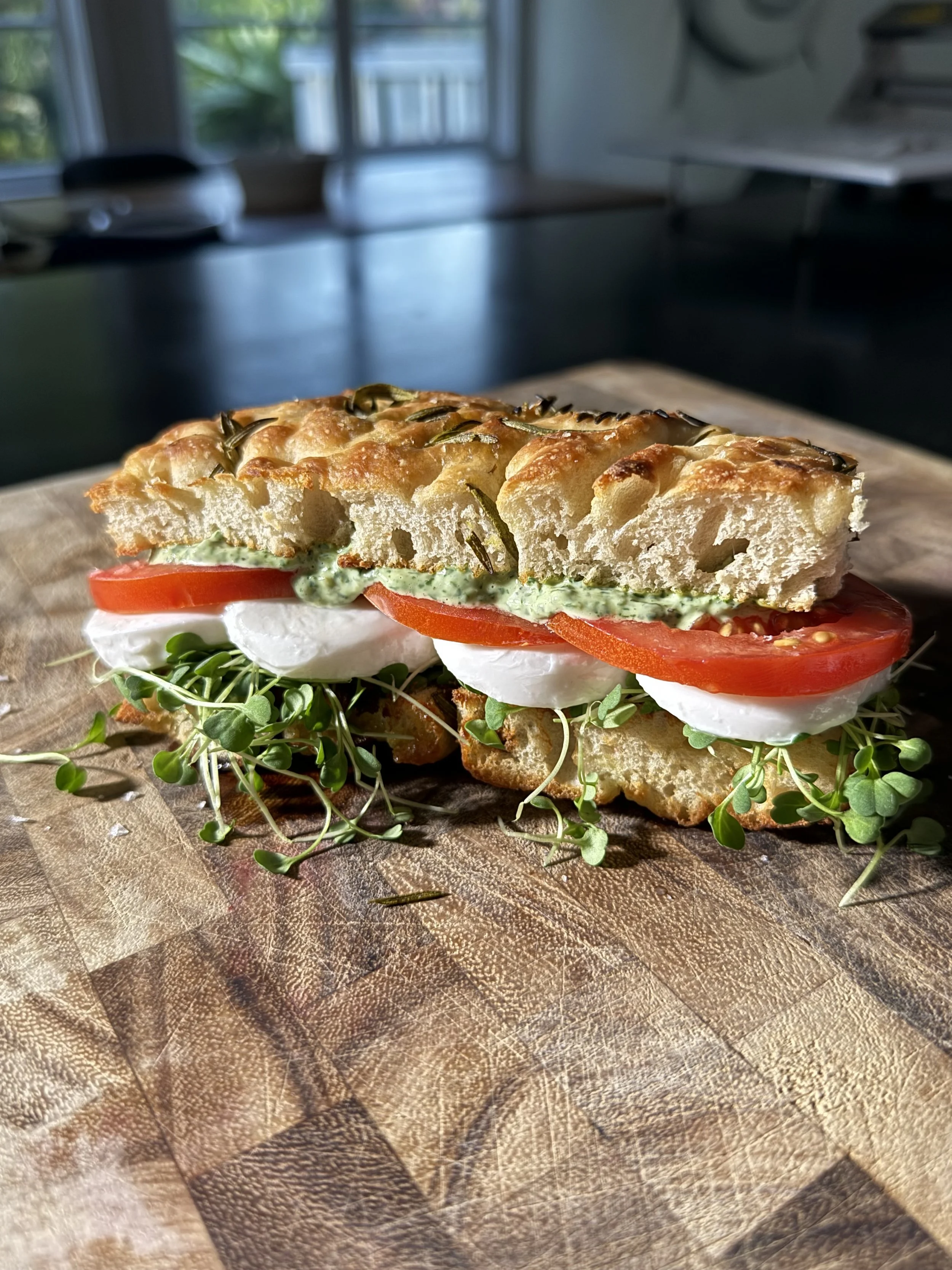 Once you have the right bread, my pesto aioli, and a handful of simple but high quality ingredients listed below you’re set. I highly recommend the rosemary sea salt focaccia posted on the blog (or plain focaccia). It has the most appropriate texture and taste in combination with the other delicate ingredients. Also, I highly recommend adding arugula (and even better micro arugula).